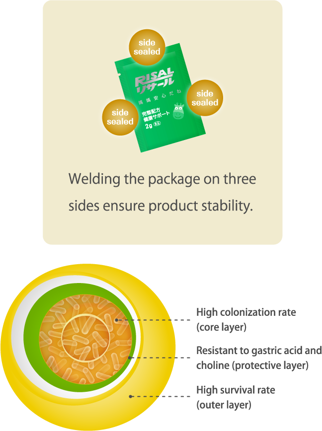 Our probiotic products use our patented microcapsulization that can take probiotics safely through the gastric acid to the digestive tract, and the sachet is sealed by a weld on three sides to maintain product quality.