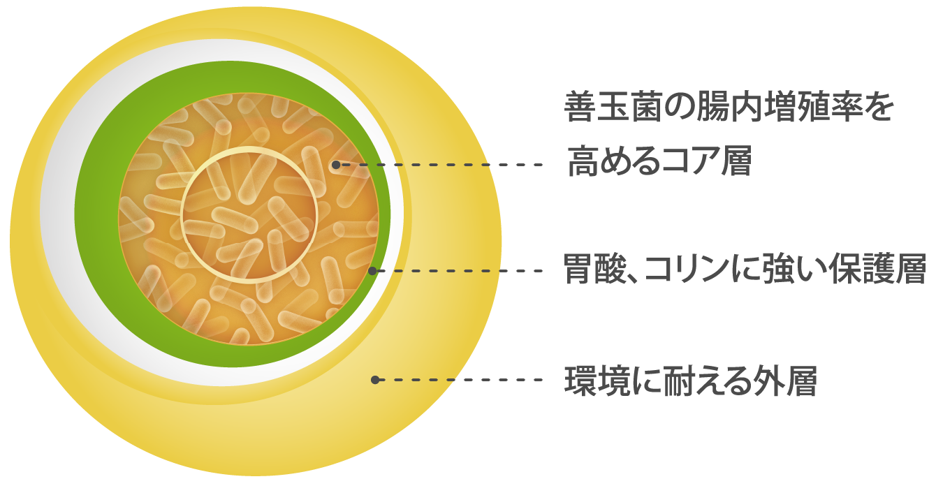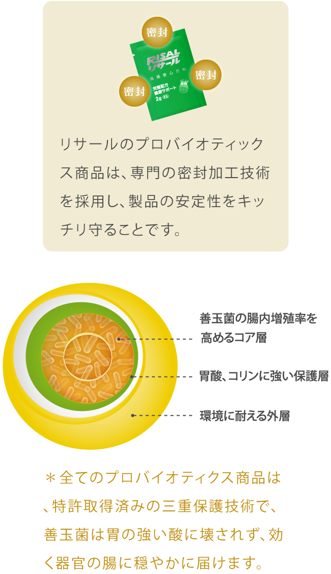 *全てのプロバイオティクス商品は、特許取得済みの三重保護技術で、善玉菌は胃の強い酸に壊されず、効く器官の腸に穏やかに届けます。